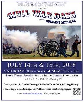 For more information, contact the California Historical Artillery Society [CHAS] at 707-922-5901 or visit the event website at: http://www.civilwardays.net. Facebook page: https://www.facebook.com/Civil-War-Days-Duncans-Mills-148190895195514/